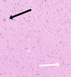 FCD40x-AnnikaBreuerUKB.jpg: Biopsy slide from epilepsy surgery, showing a focal dysplasia consisting of significantly enlarged, malformed nerve cells (black arrow) and “balloon cells,” whose nucleus is not located in their center (white arrow). Illustration: Annika Breuer/Department of Epileptology, University Hospital Bonn
